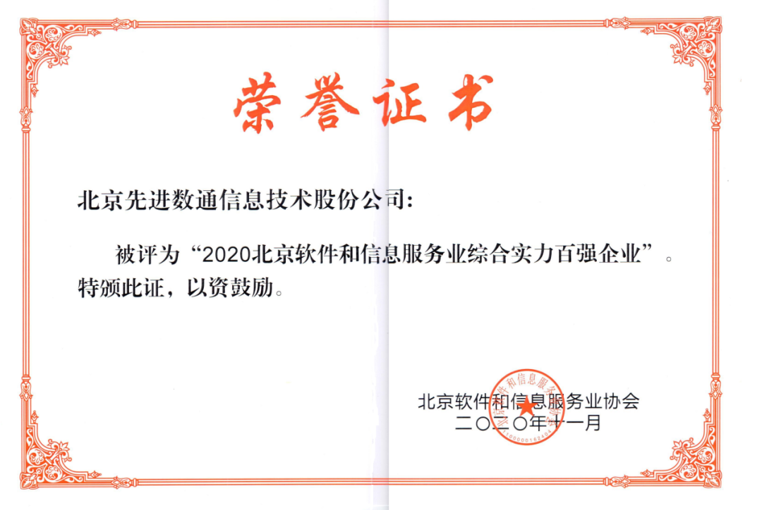 G22恒峰集团成功入选“2020北京软件和信息服务业信息综合实力百强”企业,并获评2020北京软件企业核心竞争力规模型企业。