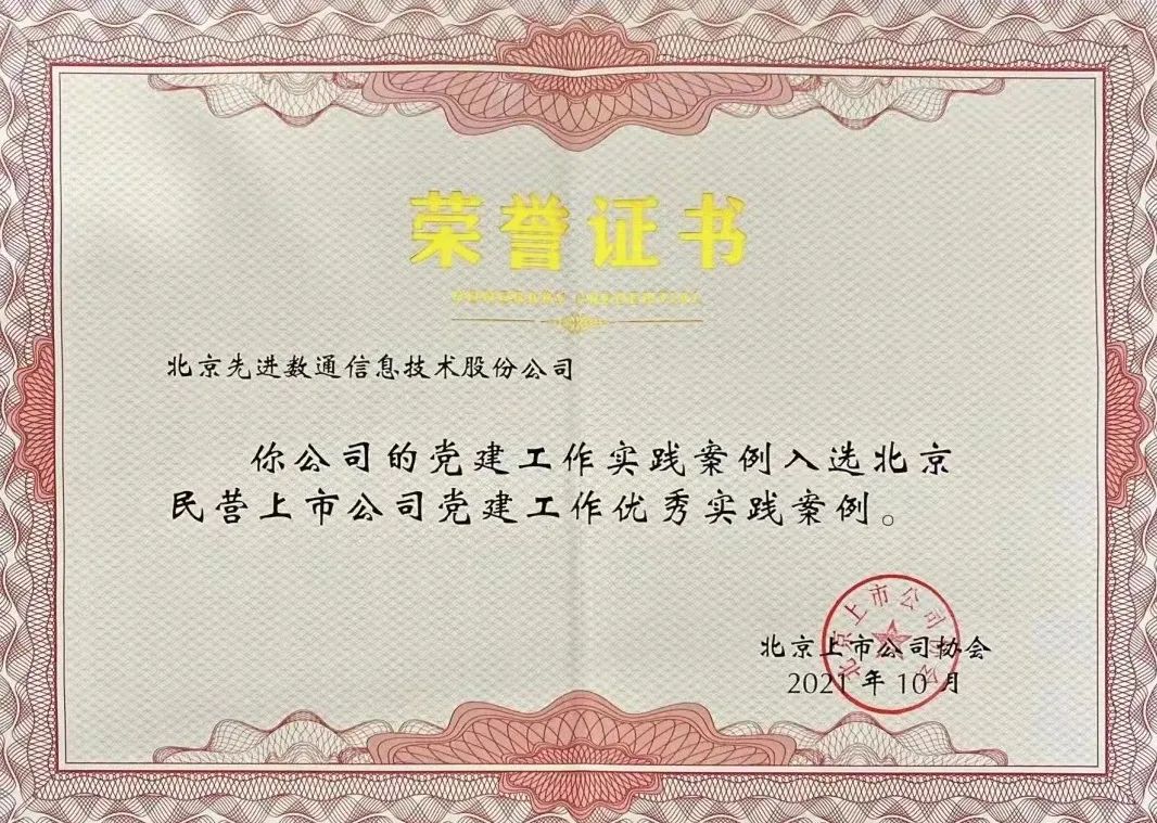 近期,北京上市公司协会授予北京G22恒峰集团信息技术股份公司荣誉证书,G22恒峰集团党建工作实践入选北京民营上市公司党建工作优秀实践案例,相关党建活动已收录在《北京民营上市公司党建工作优秀实践案例汇编》。